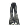 These dark-washed, high-waisted flare jeans feature a dramatic gradient fade and unique diagonal seam detailing that creates a sculptural, bold look. The exaggerated bell-bottom design adds volume and an eye-catching silhouette, making these jeans perfect for statement styling.