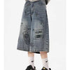 These denim culottes make a unique statement with their array of eclectic prints and doodles, including a vintage phone, a peace sign, and various other retro and whimsical graphics. The faded light blue denim serves as a perfect canvas for the black illustrations that give the piece a distinctively nostalgic vibe. The culottes offer a wide-leg design, providing both style and comfort, and the raw hem adds a touch of edginess.