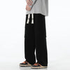 These black wide-leg cargo pants provide a minimalist and functional style with spacious side pockets and an adjustable drawstring waist. Perfect for a comfortable and modern streetwear look.