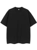 This sleek black t-shirt features a minimalist design with a simple round neckline and short sleeves. Its loose, boxy fit creates a modern, relaxed silhouette that works well for both casual and streetwear-inspired outfits.