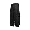 These black cargo pants feature an oversized, baggy silhouette with a functional, streetwear-inspired design. The prominent side cargo pocket and drawstring waistband enhance the utilitarian style. The loose fit and ruched seams contribute to a relaxed, modern aesthetic ideal for casual and urban wear.