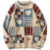 This cream-colored patchwork sweater brings together a charming combination of heart motifs, checks, and stripes. The red and blue hues create a warm, vintage-inspired design. Its cozy, knit fabric and playful pattern make it a great option for casual outings, offering both comfort and style.